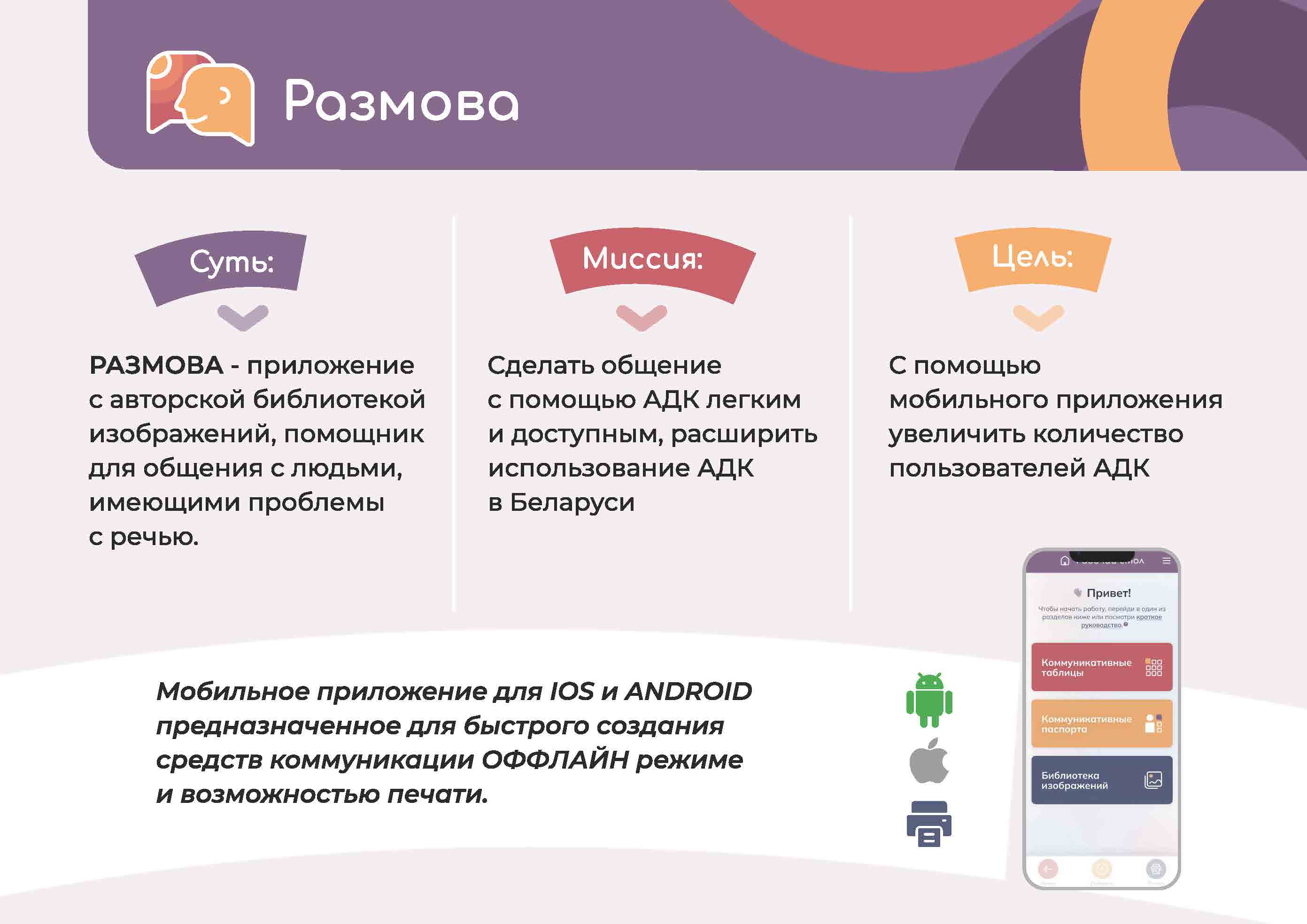 Наша РАЗМОВА – это приложение с авторской библиотекой изображений, будет помогать общению с людьми, имеющими проблемы с речью.
