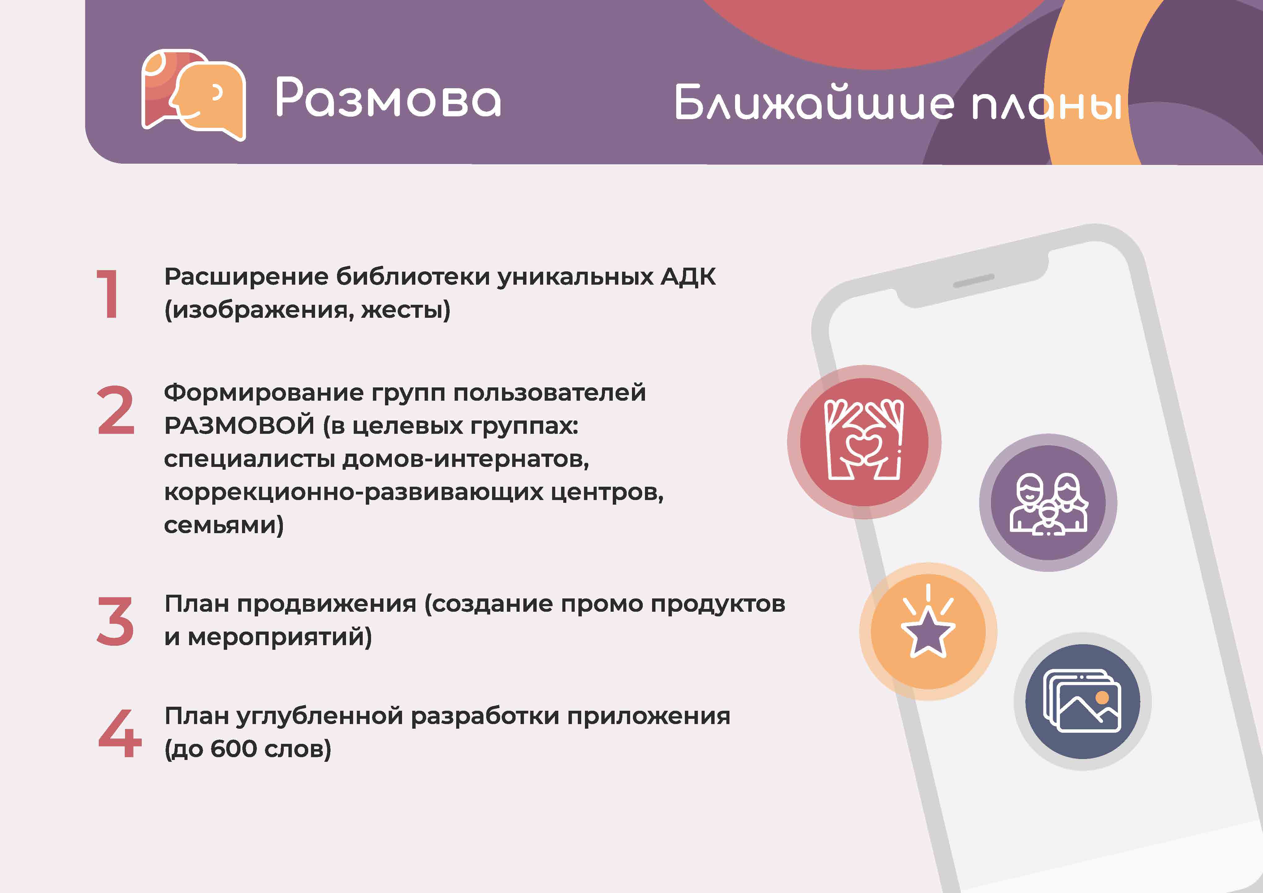 Разработка мобильного приложения RAZMOVA, переводчика базовых слов на АДК, поможет специалистам быстро создавать альтернативные средства для общения с невербальными детьми. За время работы проекта стало понятным ведущая роль взрослого, родителя, замещающего родителя или воспитателя, в том, чтобы помочь невербальному ребенку выражать свои желания, эмоции, волю.