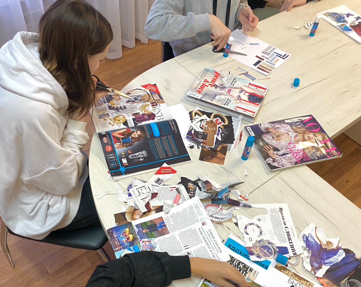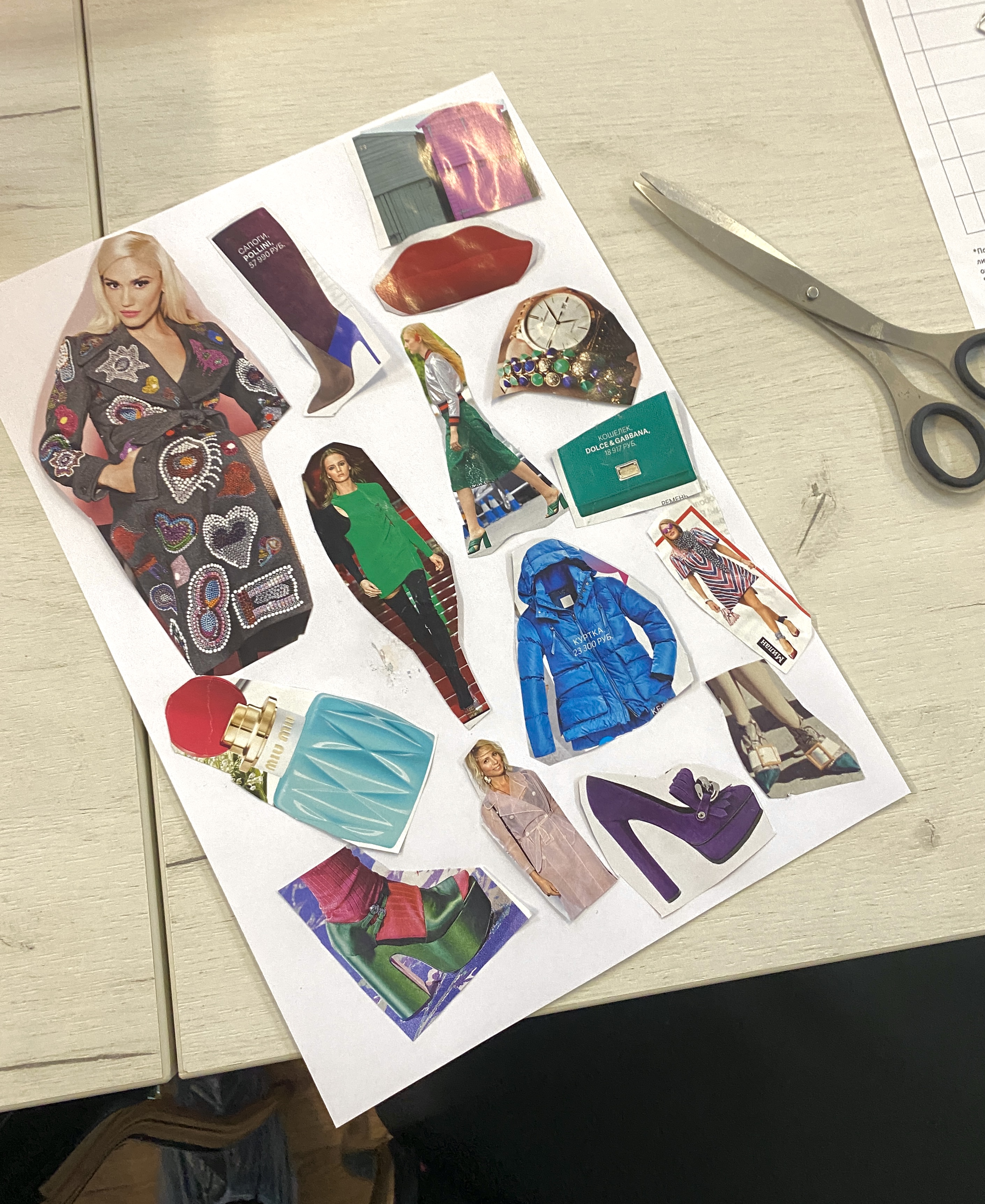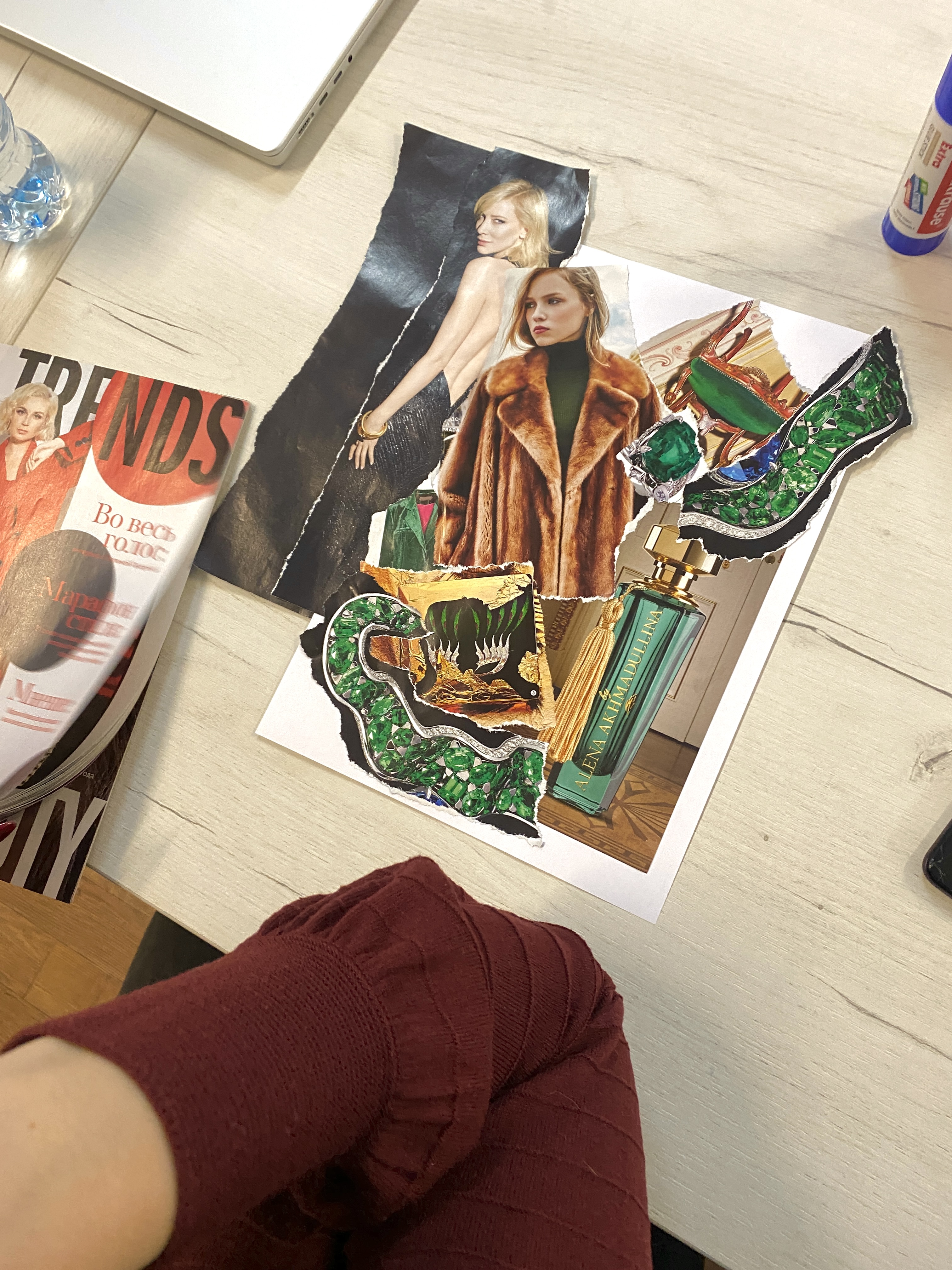 Наталья подготовила очень креативное, занимательное задание: сделать moodboard («коллаж настроения») на основании элементов одежды, аксессуаров и деталей, вырезанных из глянцевых журналов). Получился настоящий сеанс цветотерапии!